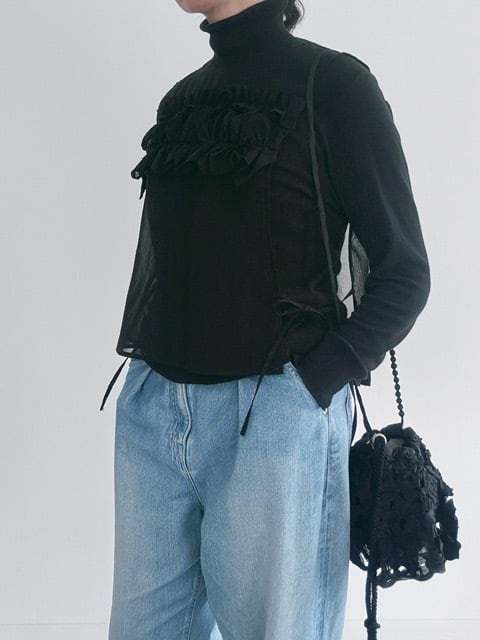 ギャザーフリルが印象的なジレ。