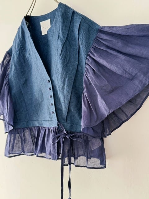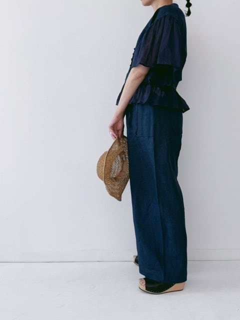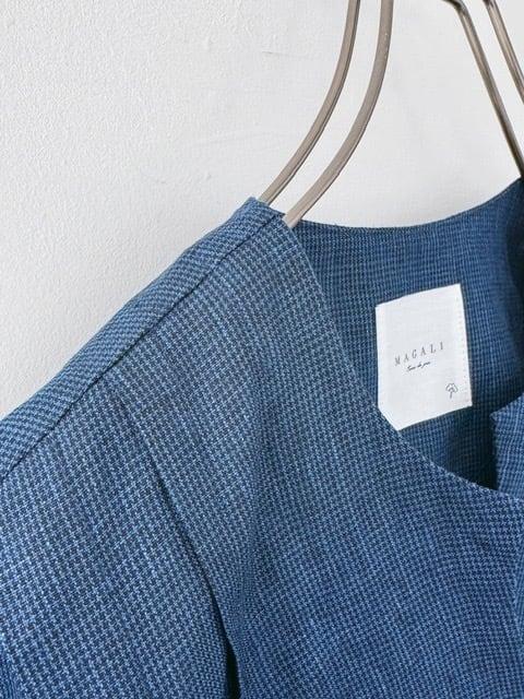 小さなチェック柄とインディゴ染めのリネンを使用。