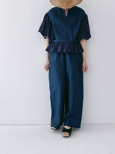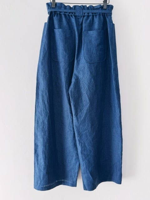 軽やかさと美しい佇まいを兼ね備えた ストレートラインのワイドパンツ。 ウエストはゴム仕様で着脱も楽な着心地。 同素材のリボンでサイズ調整可能。 小さなチェック柄のインディゴ染めのリネンを使用。 肌離れのよいさらりとした風合いで 通気性と軽さがあり春夏の装いにぴったりです。 インディゴ リネン100% ウエスト72~94 股上32/46 股下67 着丈102 ヒップ周り116 もも周り76 着画身長163