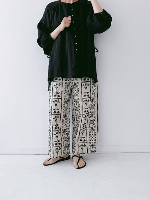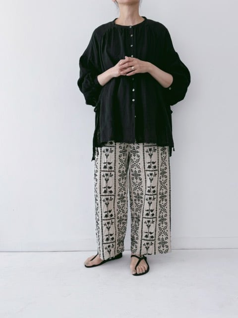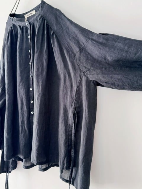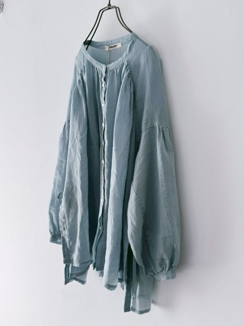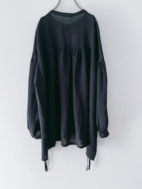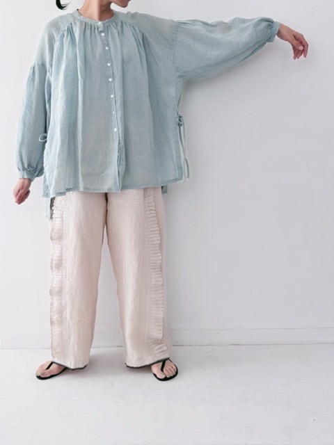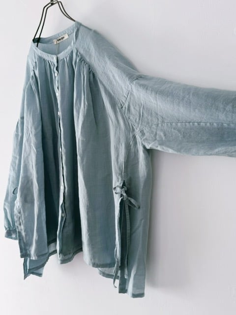 涼やかな透け感のあるブラウス。 ラミーのシャリ感とテンセルのほんのり光沢感と とろみが柔らかなドレープを生み きれいなシルエットを作ってくれます。 両サイドのリボンはそのまま垂らしたり 結んだりその日の気分で〇 light blue black ラミー55% テンセル45% 身幅約77 アームホール約37 裄丈約76 着丈約67/72 着画身長163